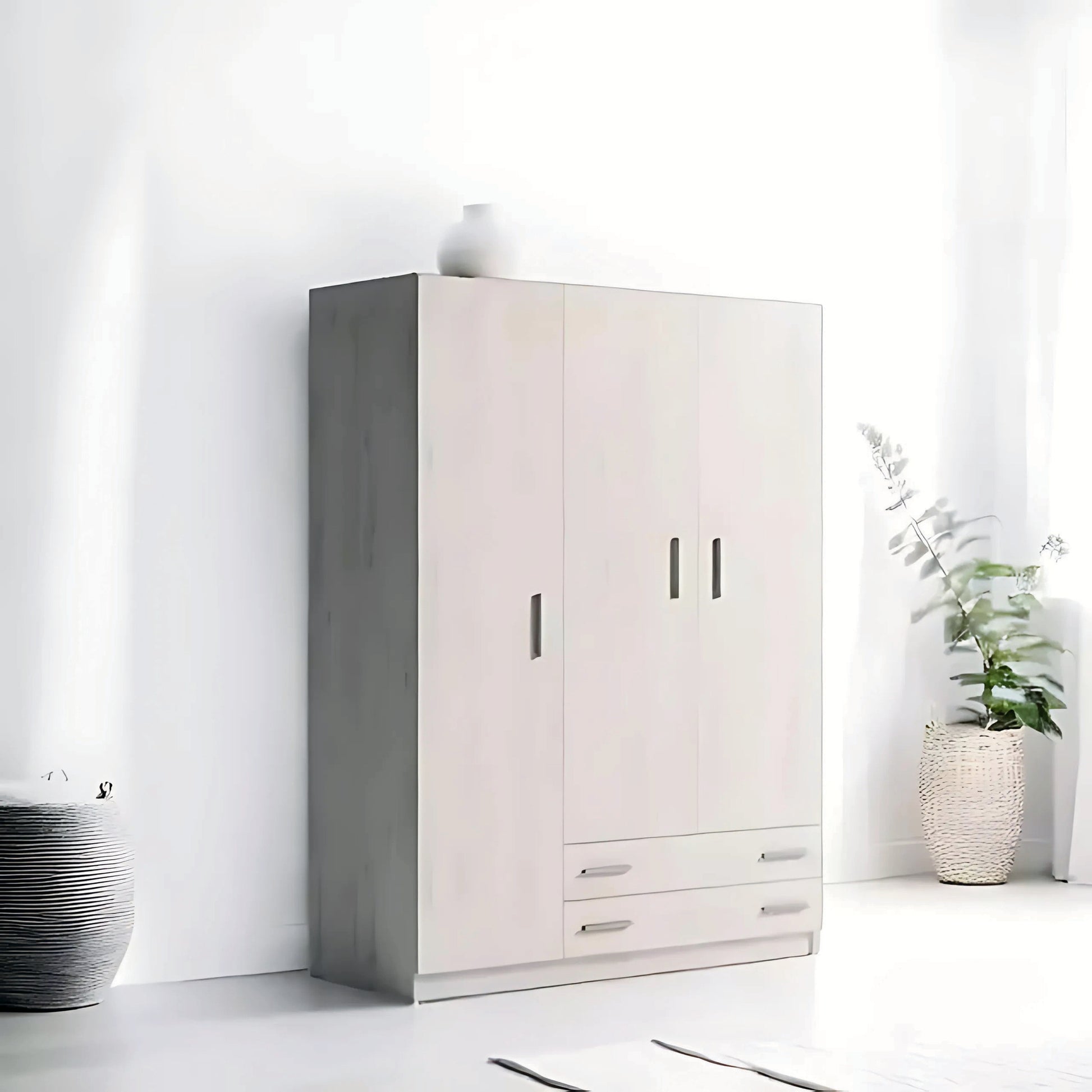 Moderno, funcional y con mucho estilo. Este armario ofrece una excelente distribución interior con estantes, dos cajones y puertas batientes que facilitan el acceso. Perfecto para mantener tu ropa y accesorios siempre organizados.